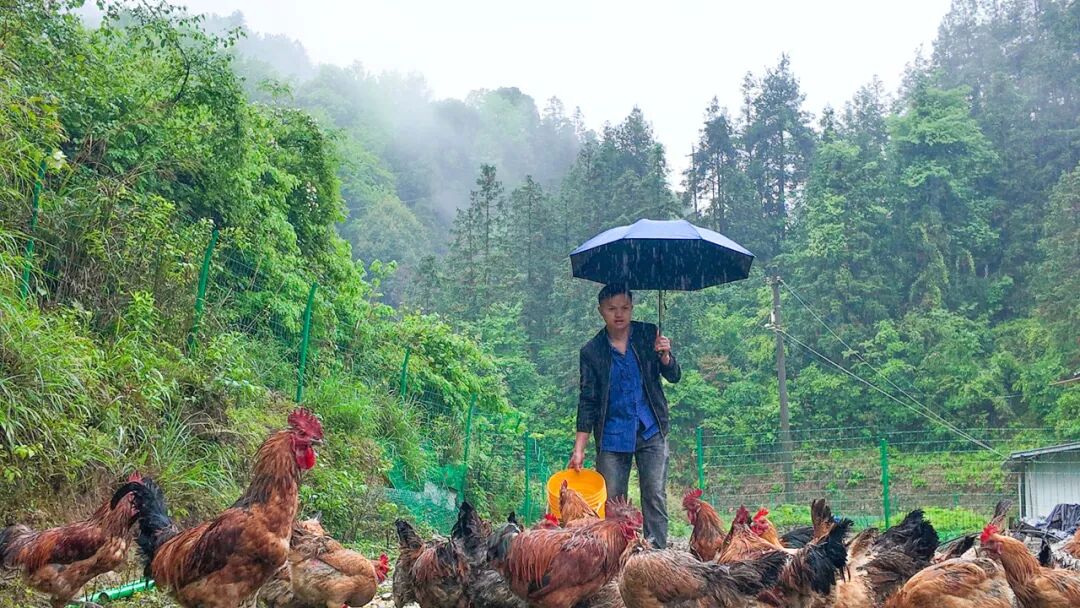 作为当地小有名气的“新农人”,吴正滨有着8年的养鸡经验,而田星瑶更是深耕养殖行业10余年。2024年10月,二人瞄准生态养殖商机,扎根沿坪村,以沿坪为核心,在盘石、正大、盘信等乡镇同步布局土鸡合作养殖点,构建起“基地+农户+市场”的产销一体化模式。如今,他们产出的土鸡、土鸭、生态蛋等特色农产品,不仅成为本地农家乐、餐馆的“抢手货”,更借助直播带货和“三农”主播的影响力,突破地域限制,远销全国各地。